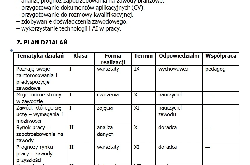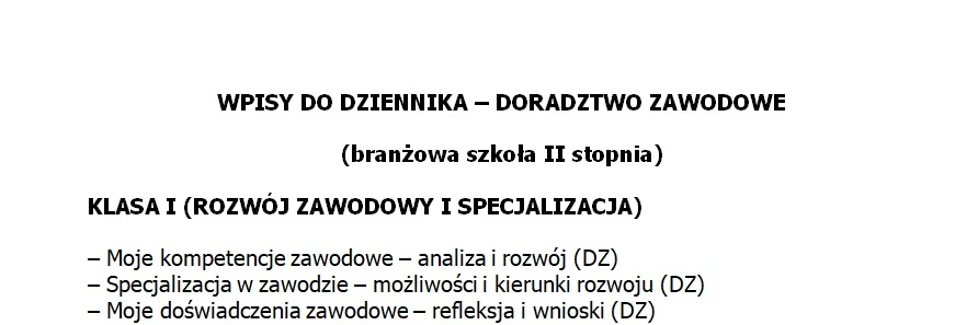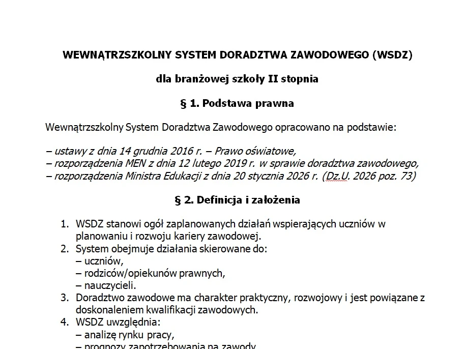 WSDZ dla szkoły branżowej 2026 – kompletny pakiet dokumentów (I i II stopnia): program roczny, wpisy do dziennika, diagnoza opracowana dla szkoły branżowej I stopnia (z możliwością wykorzystania również w branżowej II stopnia), współpraca z pracodawcami. Gotowe do wdrożenia.