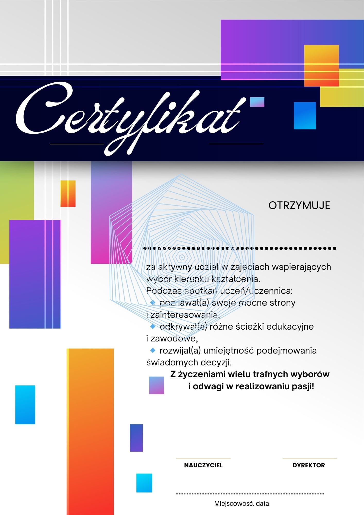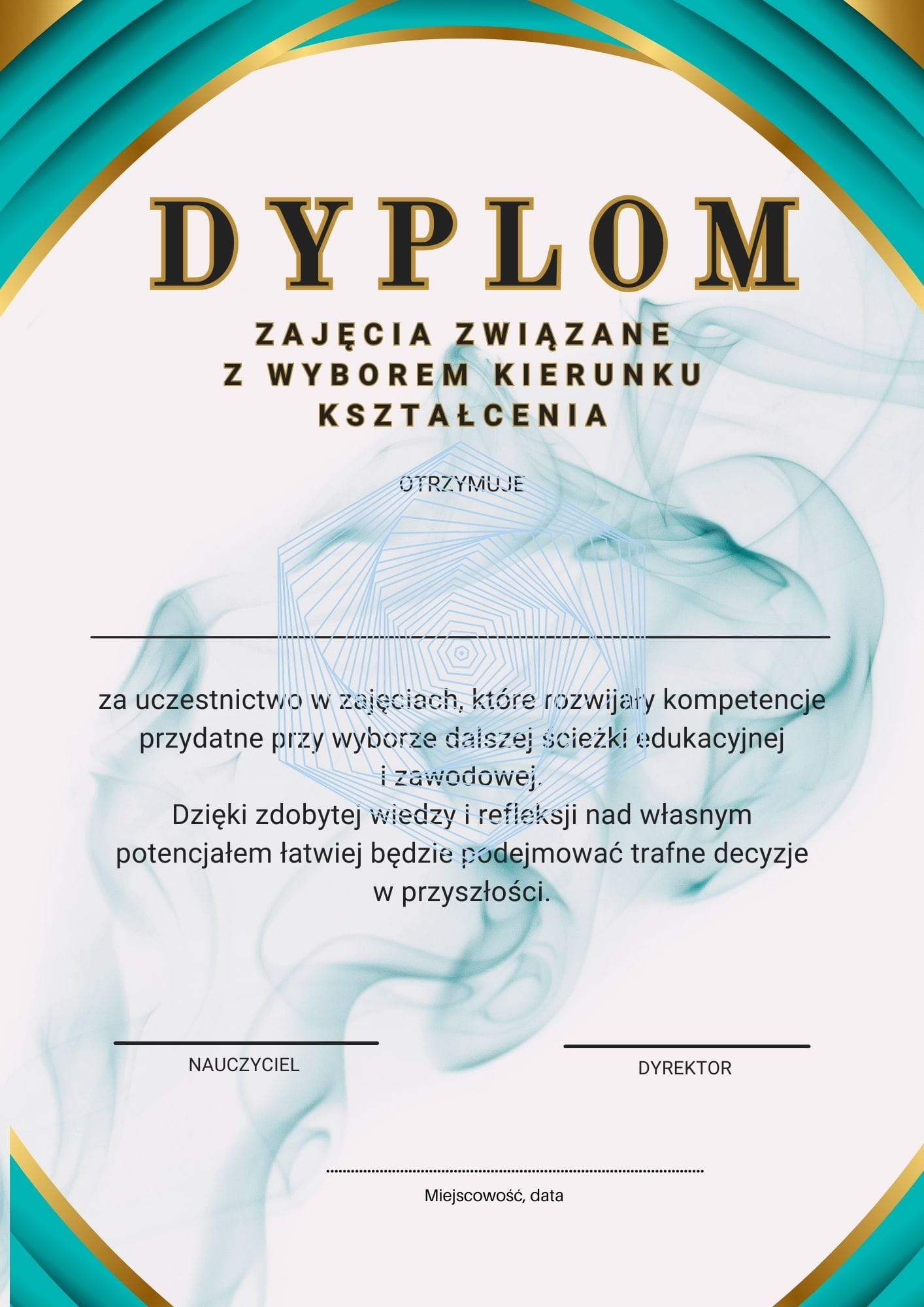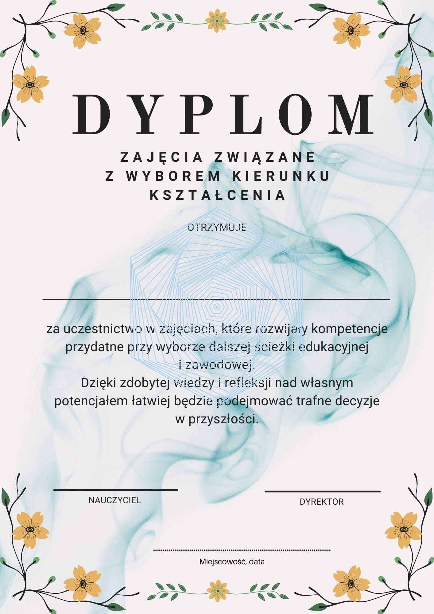 Przygotowałam dla Ciebie gotowy pakiet 6 różnych wzorów dyplomów i certyfikatów, idealnych na zakończenie cyklu zajęć związanych z wyborem kierunku kształcenia!