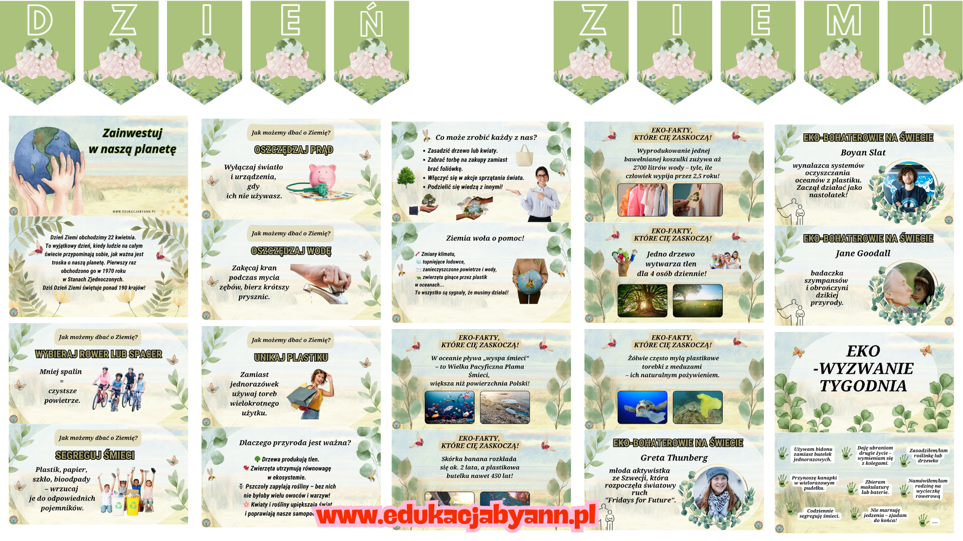 Prezentację PDF – w pełni gotową do wyświetlenia na lekcji, pełną ciekawostek, eko-faktów, pomysłów na działania i sylwetek eko-bohaterów (m.in. Jane Goodall, Greta Thunberg).