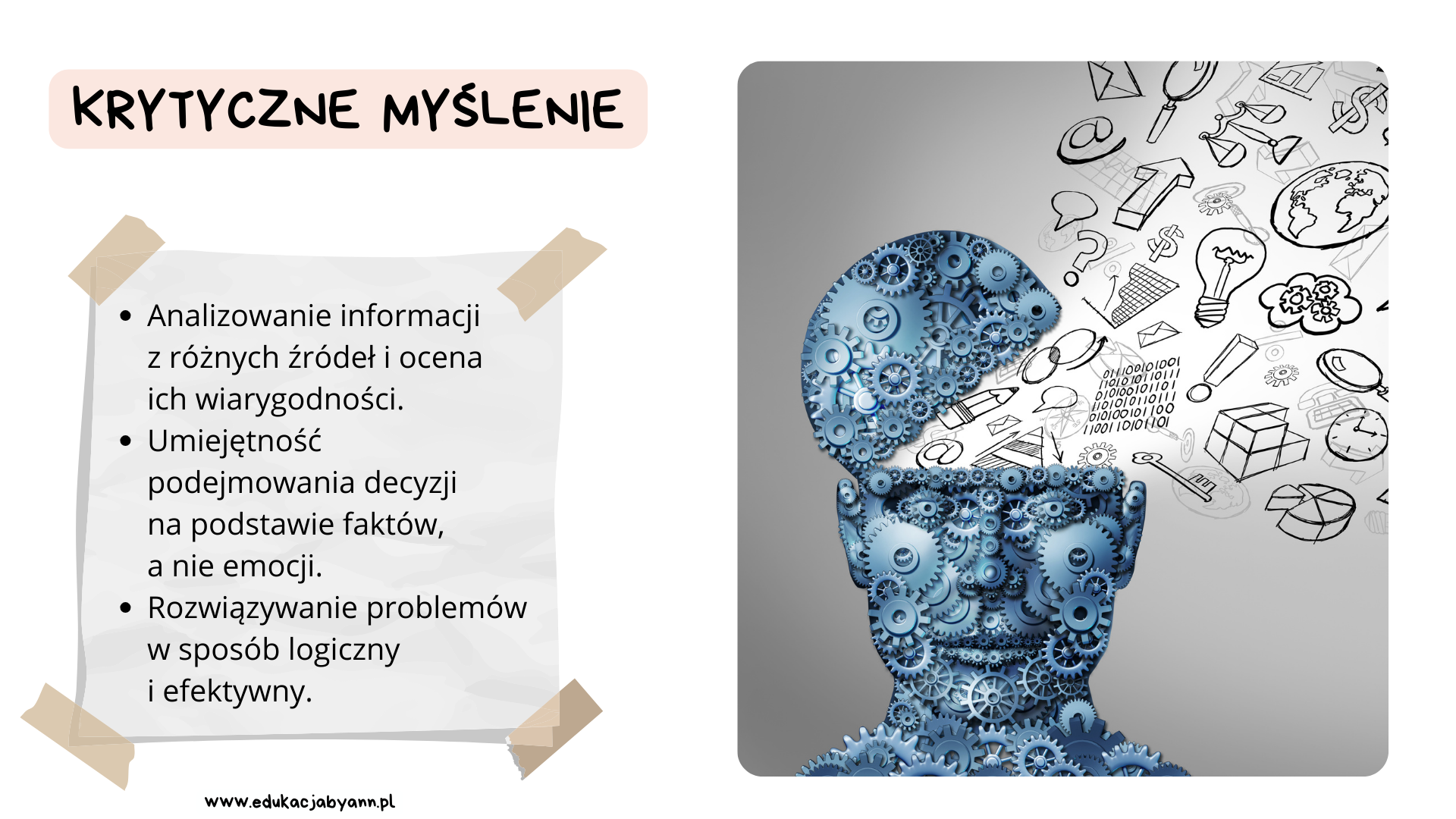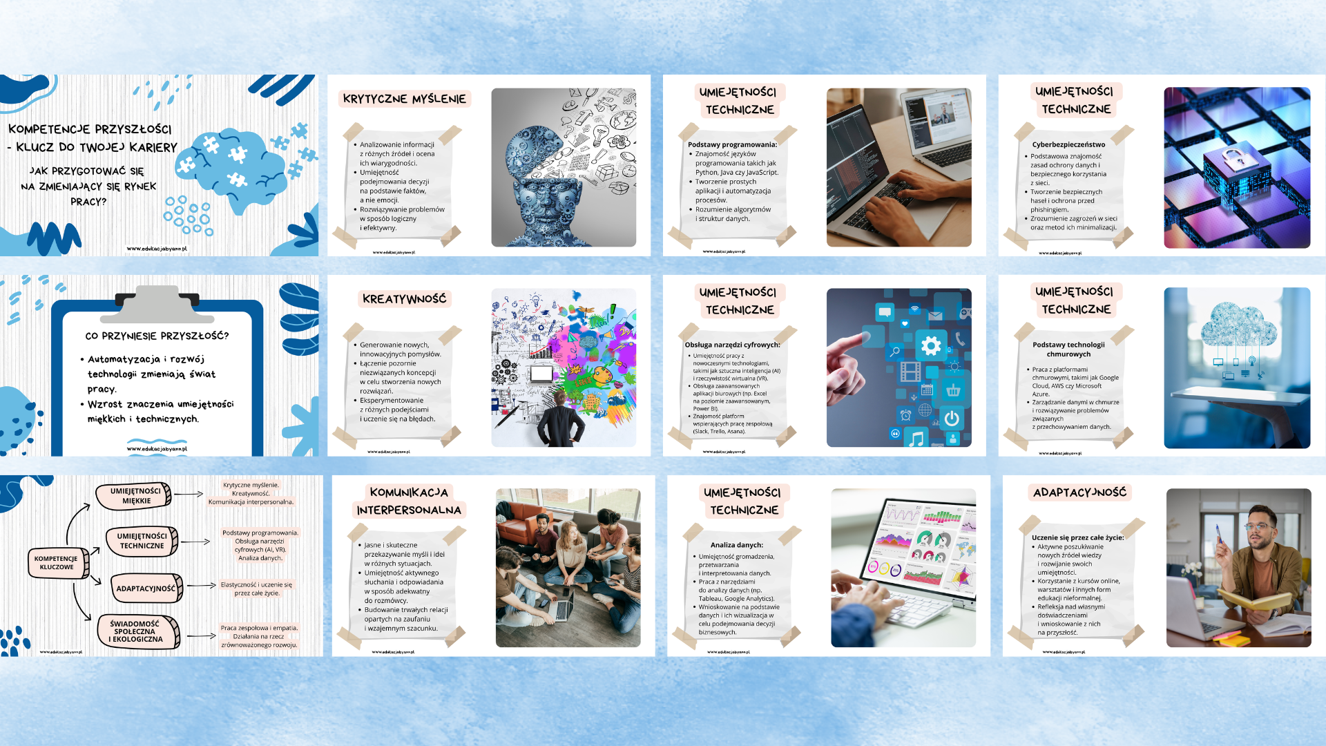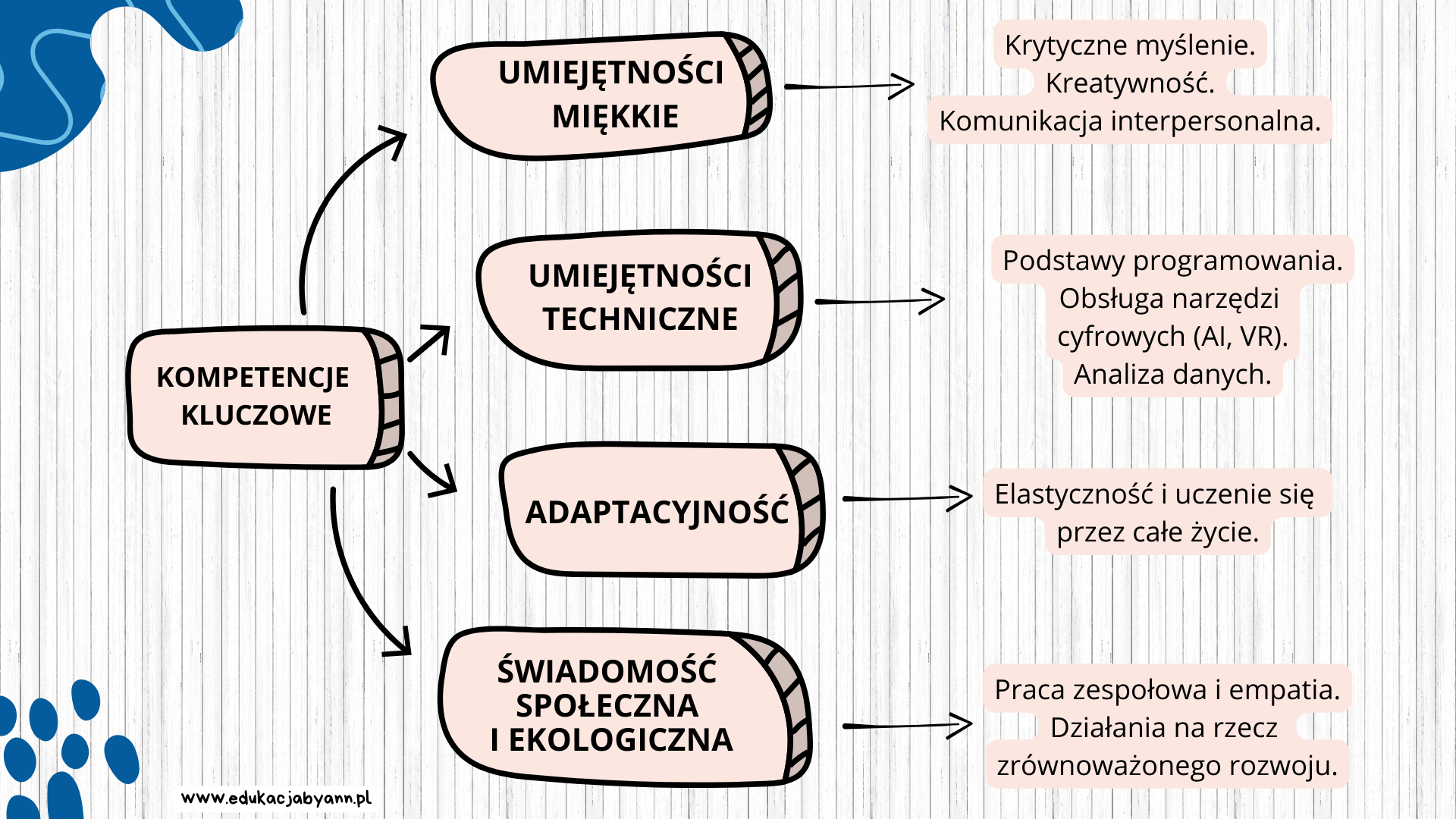 - Przejrzyste omówienie kluczowych kompetencji przyszłości: krytyczne myślenie, kreatywność, adaptacyjność i kompetencje techniczne.