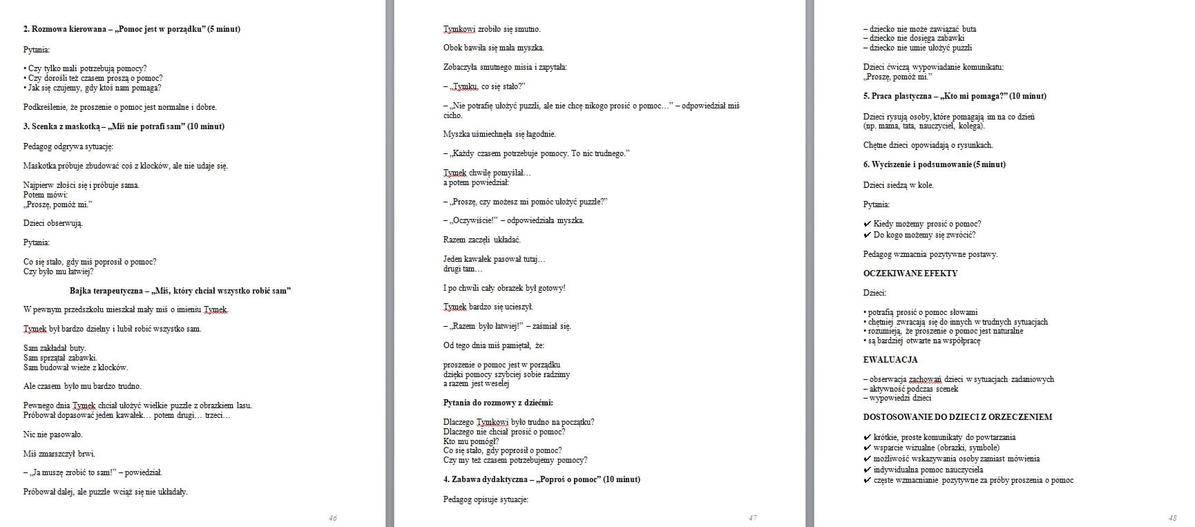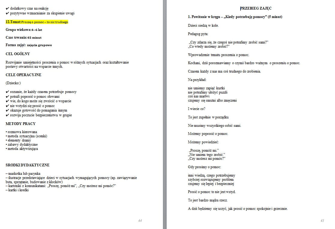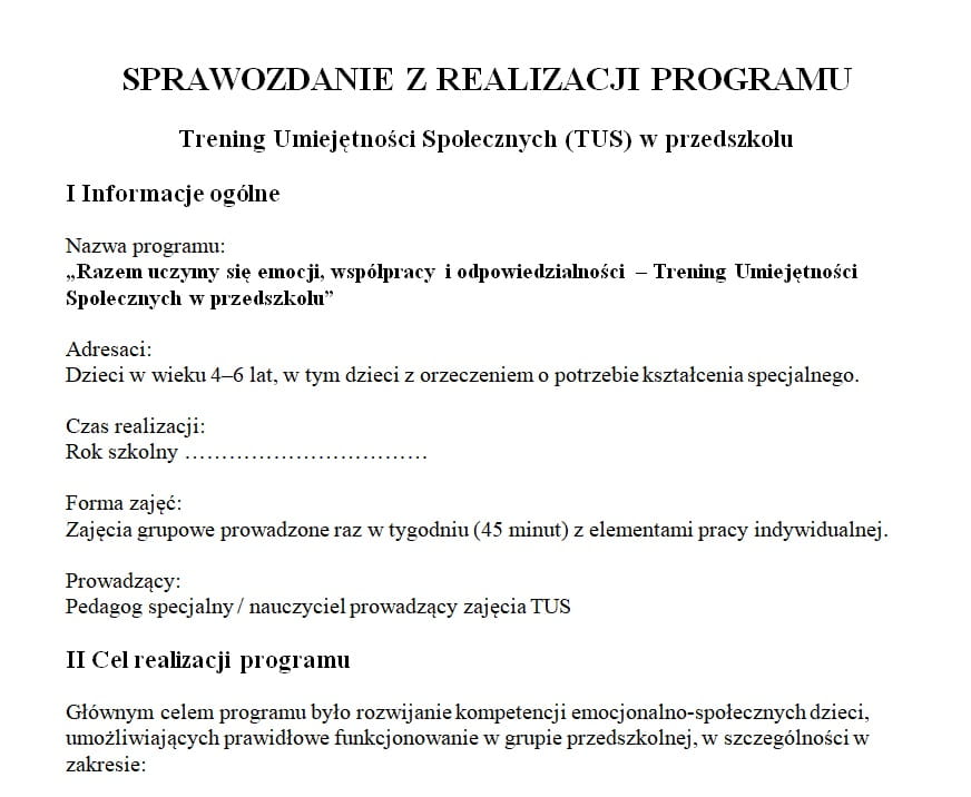 Kompleksowy program Treningu Umiejętności Społecznych (TUS) w przedszkolu dla dzieci w wieku 4–6 lat. Zestaw zawiera roczny program z podstawą prawną, szczegółowe scenariusze zajęć, bajki terapeutyczne, arkusz postępów dziecka, wzór sprawozdania z realizacji programu oraz kolorowe dyplomy dla dzieci. Materiały wspierają rozwój emocjonalny i społeczny, uczą rozpoznawania emocji, komunikacji, empatii, współpracy oraz radzenia sobie z trudnymi sytuacjami. Idealne do pracy w przedszkolach i oddziałach integracyjnych, także z dziećmi ze specjalnymi potrzebami edukacyjnymi.