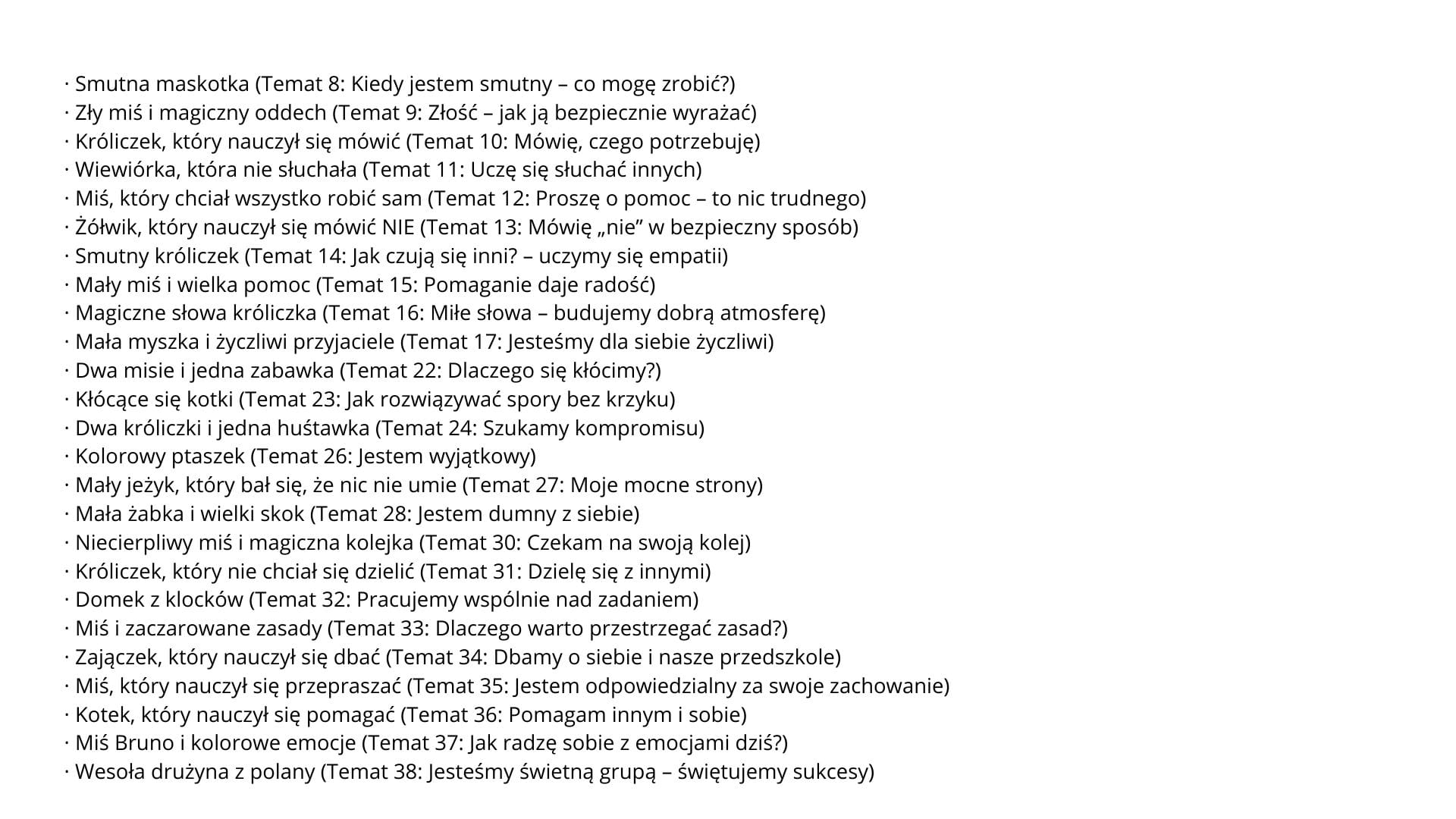 Program krok po kroku prowadzi przez takie obszary jak: emocje, empatia, komunikacja, współpraca, radzenie sobie z konfliktami, poczucie własnej wartości i odpowiedzialność