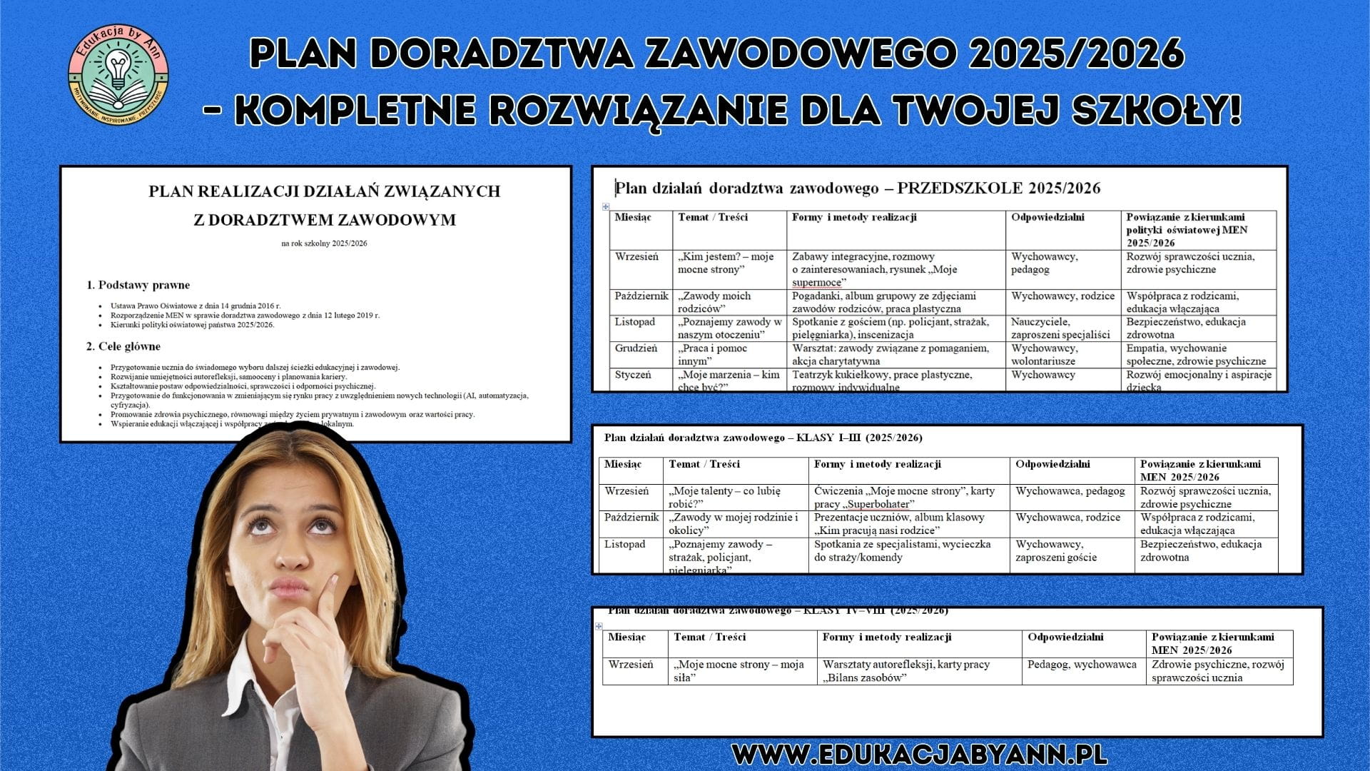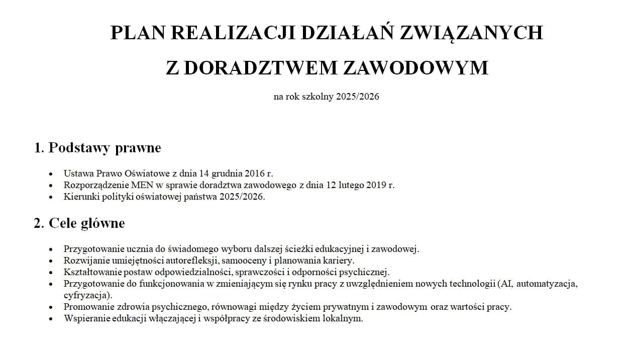 Przygotowaliśmy dla Ciebie kompletny Plan realizacji działań z doradztwa zawodowego na rok szkolny 2025/2026 – zgodny z obowiązującymi przepisami oraz kierunkami polityki oświatowej MEN 2025/2026.