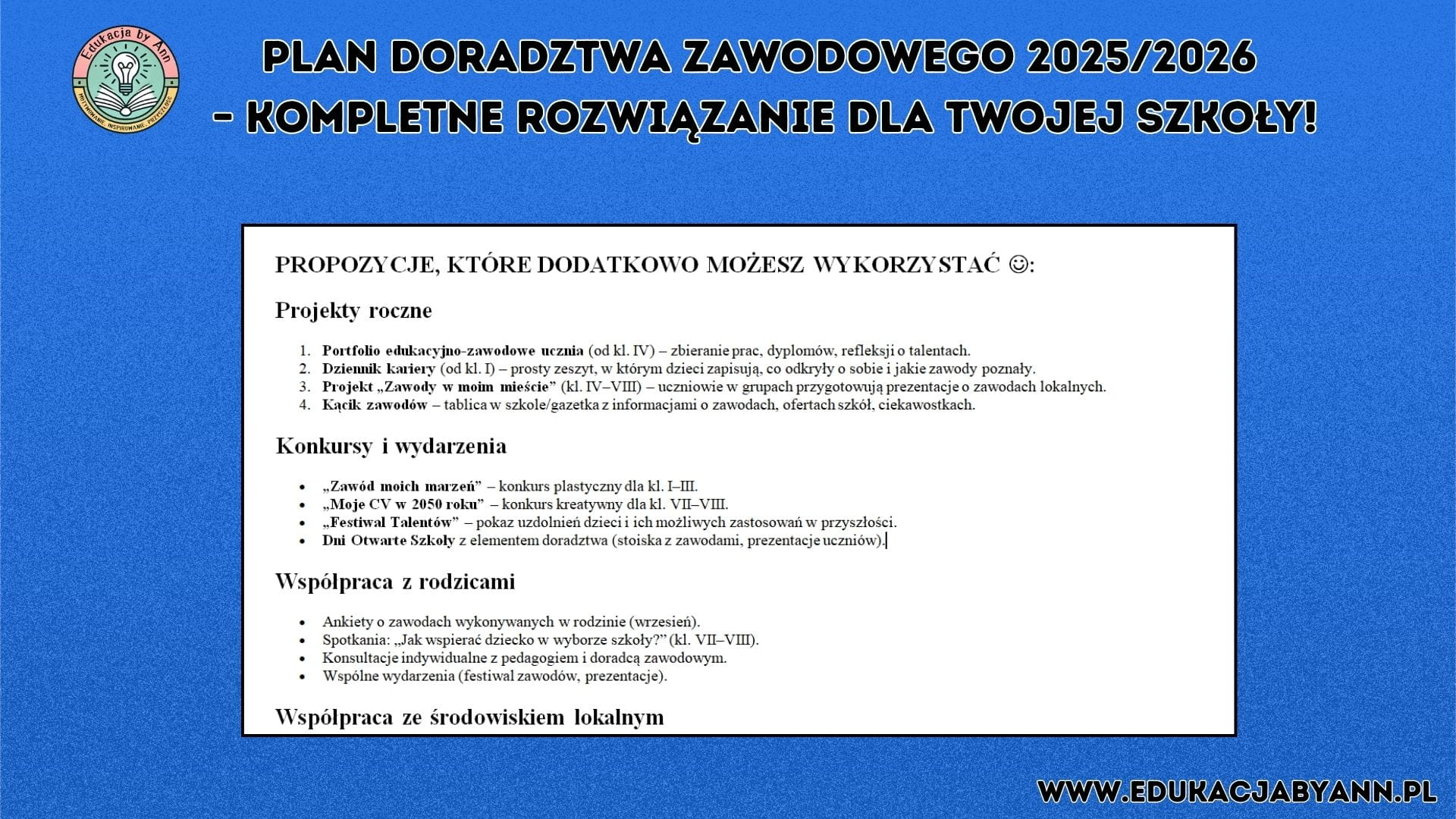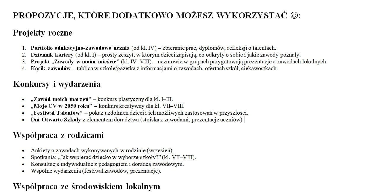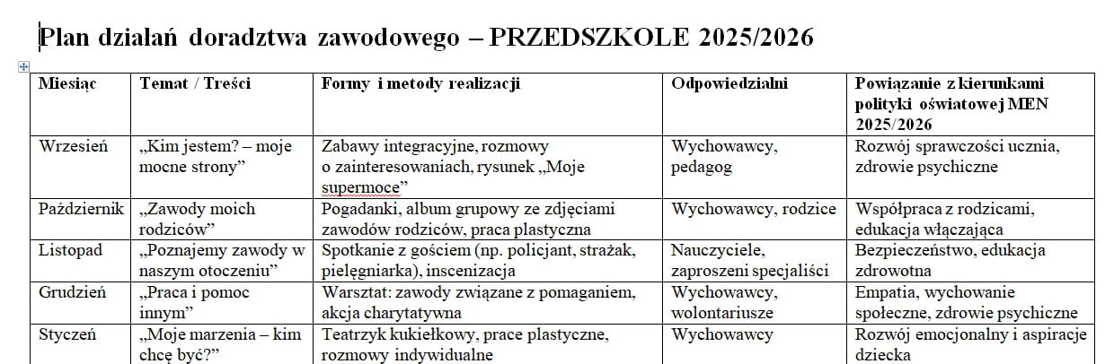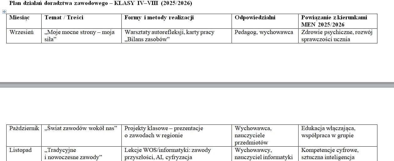 Plan działań doradztwa zawodowego 2025/2026 – przedszkole i szkoła podstawowa (klasy 1–8) – 10 stron w pliku DOCX do edycji