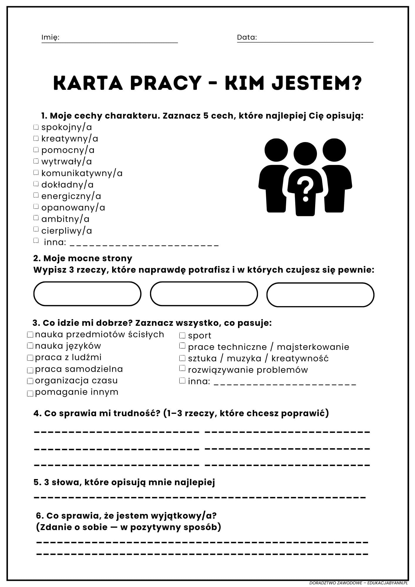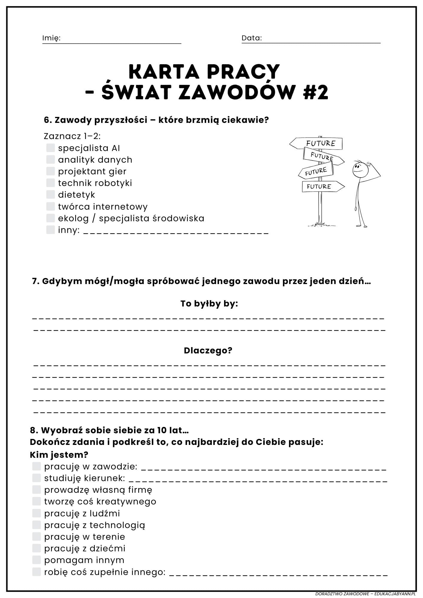 Kompletny pakiet do doradztwa zawodowego dla klas 6–8: 9 kart pracy, pełny scenariusz lekcji i certyfikat. Uczniowie tworzą profesjonalne portfolio, a nauczyciel oszczędza czas dzięki gotowym materiałom. Dostępne na EdukacjabyAnn.