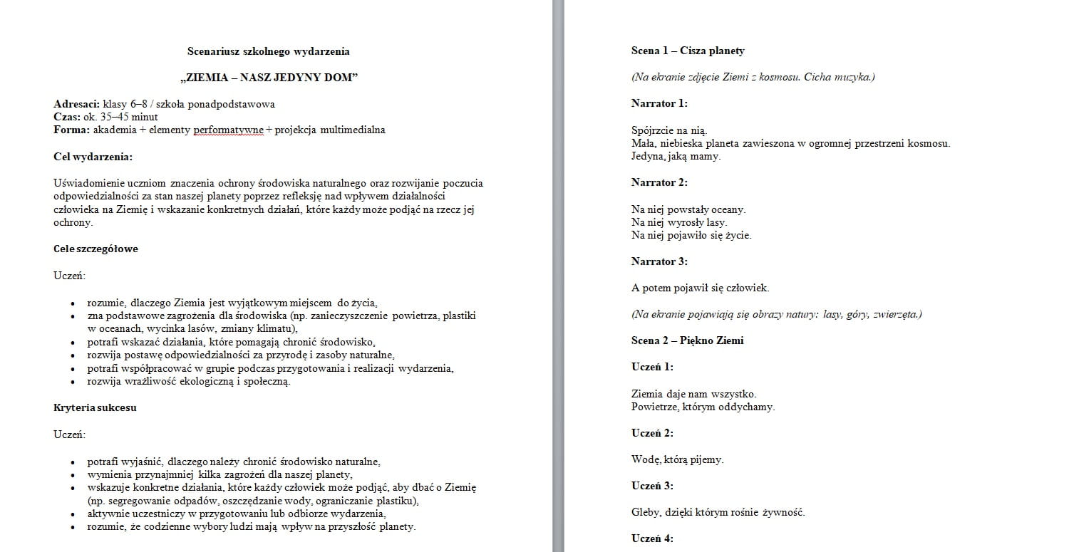 Scenariusz ma dynamiczną i angażującą formę – zamiast tradycyjnej, długiej akademii proponuje krótkie sceny, narrację oraz elementy refleksji, które pomagają uczniom zrozumieć, jak ich codzienne wybory wpływają na przyszłość Ziemi.