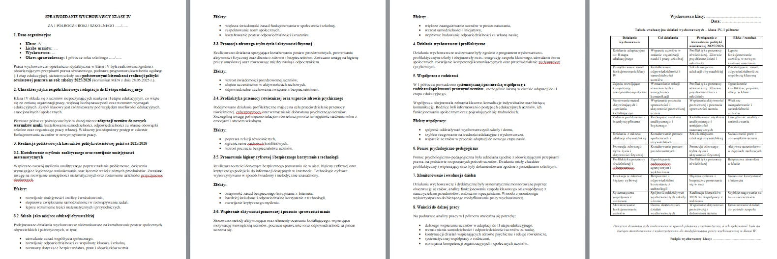 Sprawozdanie wychowawcy klasy IV za I półrocze roku szkolnego 2025/2026, przygotowane zgodnie z kierunkami polityki oświatowej MEN. Dokument uwzględnia adaptację uczniów do II etapu edukacyjnego, działania wychowawcze, współpracę z rodzicami oraz tabelę ewaluacyjną. Napisany językiem nadzoru pedagogicznego, gotowy do wykorzystania w dokumentacji szkolnej i podczas kontroli.