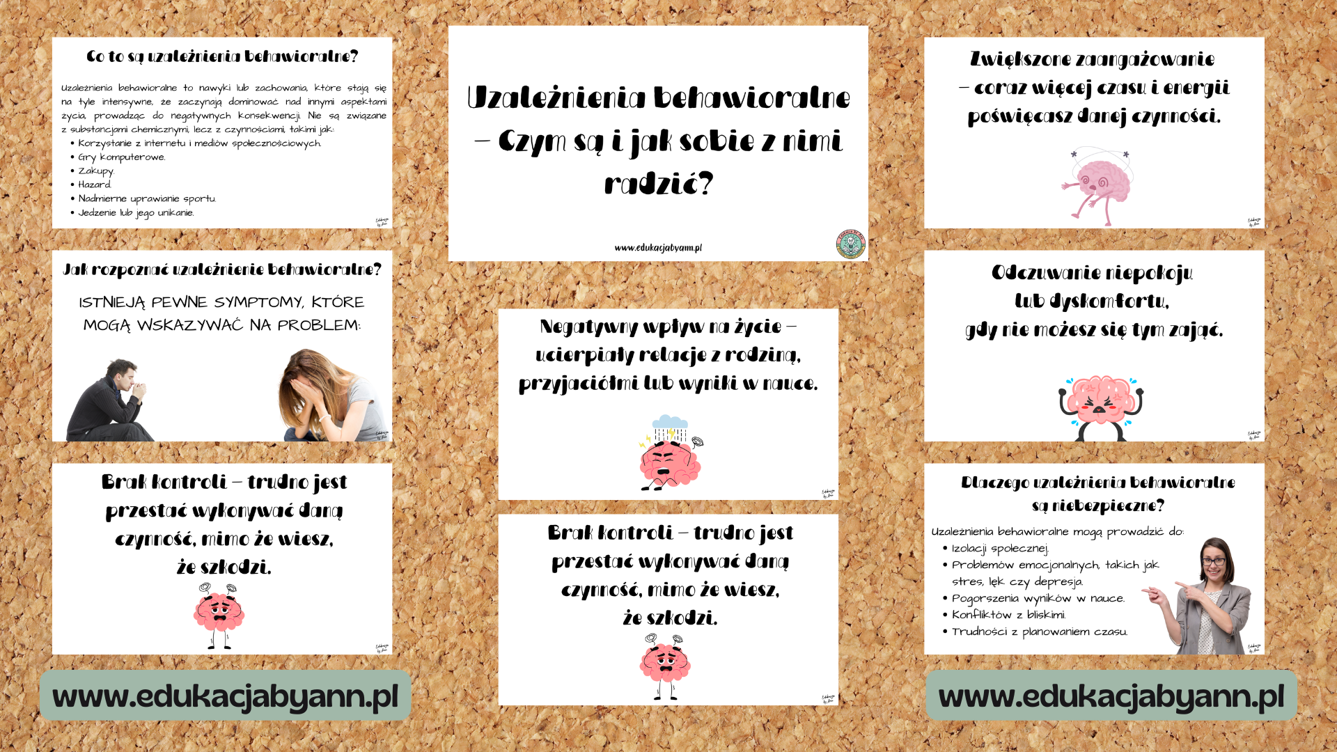 Profesjonalne opracowanie o uzależnieniach behawioralnych, stworzone z myślą o nauczycielach, pedagogach i rodzicach. Przejrzyste, zrozumiałe i pozbawione zbędnych ozdobników, idealnie nadaje się do zaprezentowania w szkole jako materiał edukacyjny dla uczniów i ich opiekunów.