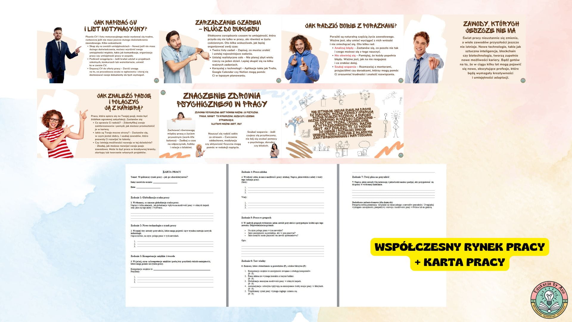Dodatkowo opracowana karta pracy to idealne narzędzie do praktycznego zastosowania wiedzy, ułatwiające uczniom zrozumienie zmian na rynku pracy i planowanie ich pierwszych kroków zawodowych.