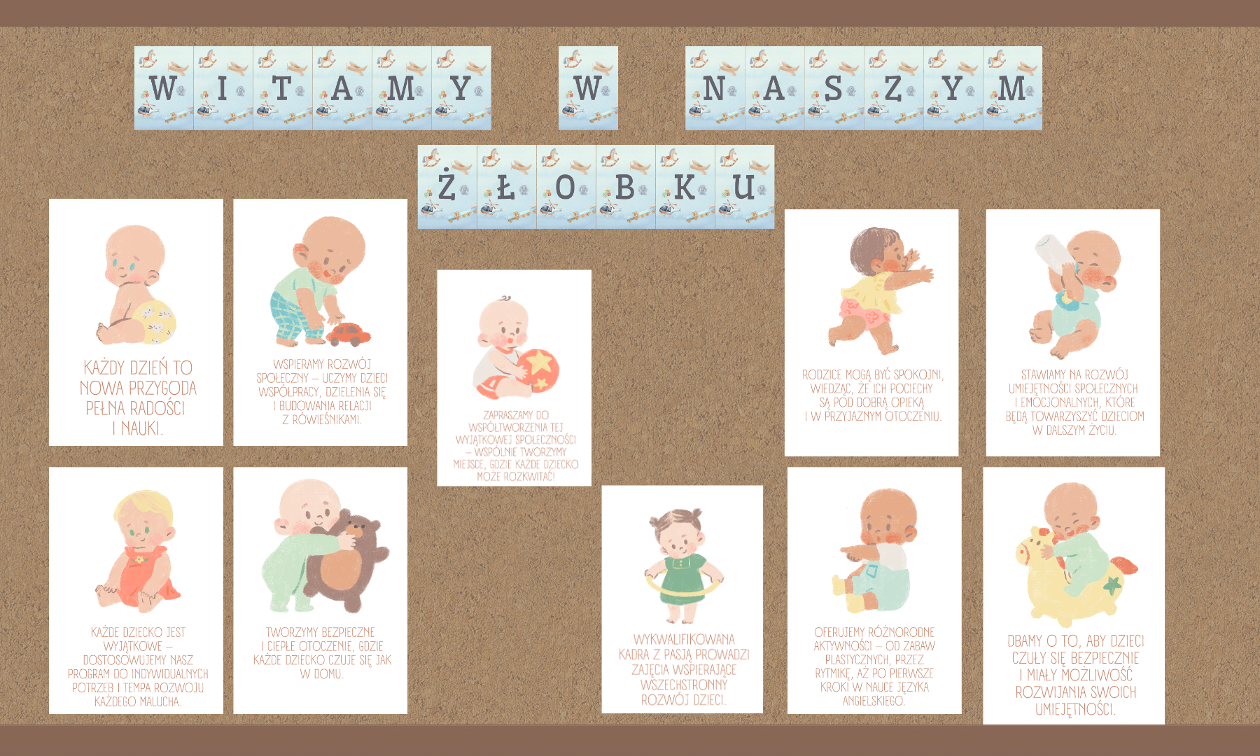 Kolorowy i przyjazny materiał informacyjny stworzony z myślą o żłobkach. Zawiera inspirujące treści dla opiekunów, nauczycieli oraz rodziców, podkreślające kluczowe aspekty rozwoju dzieci, takie jak współpraca, indywidualne podejście oraz bezpieczne, pełne ciepła otoczenie. Ilustracje przedstawiające dzieci w codziennych aktywnościach wprowadzają radosną atmosferę, motywując najmłodszych do nauki przez zabawę. To doskonały materiał do dekoracji i informowania w przestrzeniach żłobkowych.
